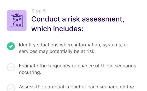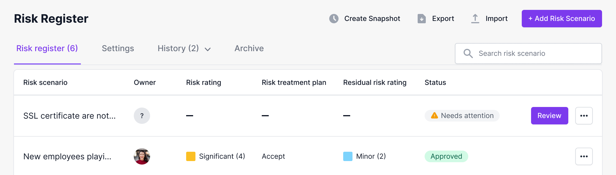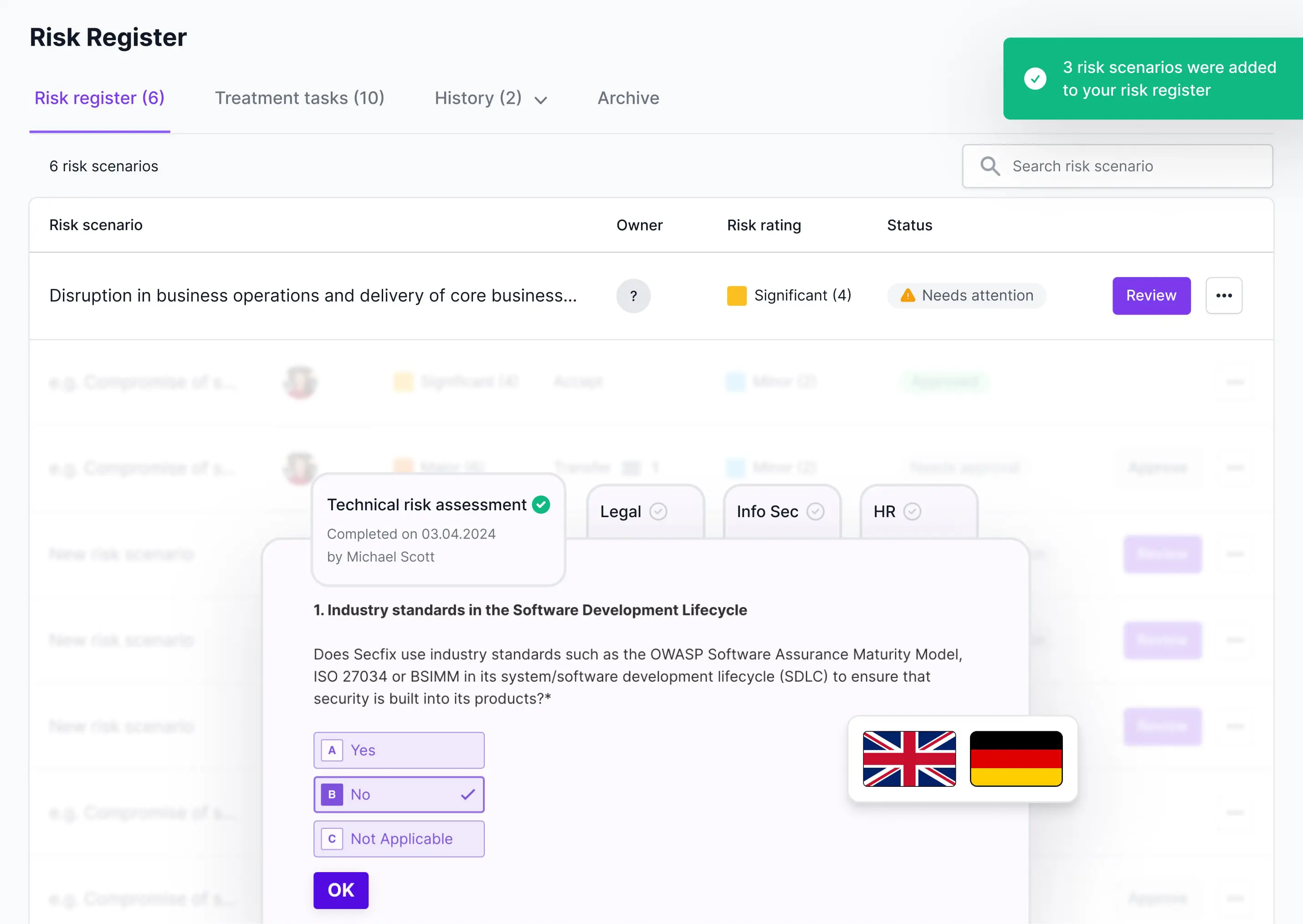 Automate risk assessments and link risks to over 100 pre-mapped controls. Use Secfix’s guided questions to identify new risks. Manage, track, and review risks efficiently and regularly from a single place.