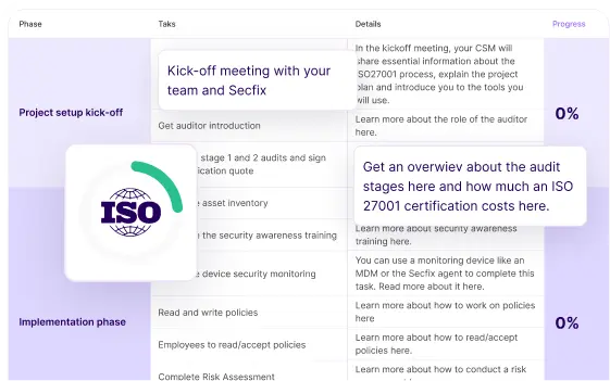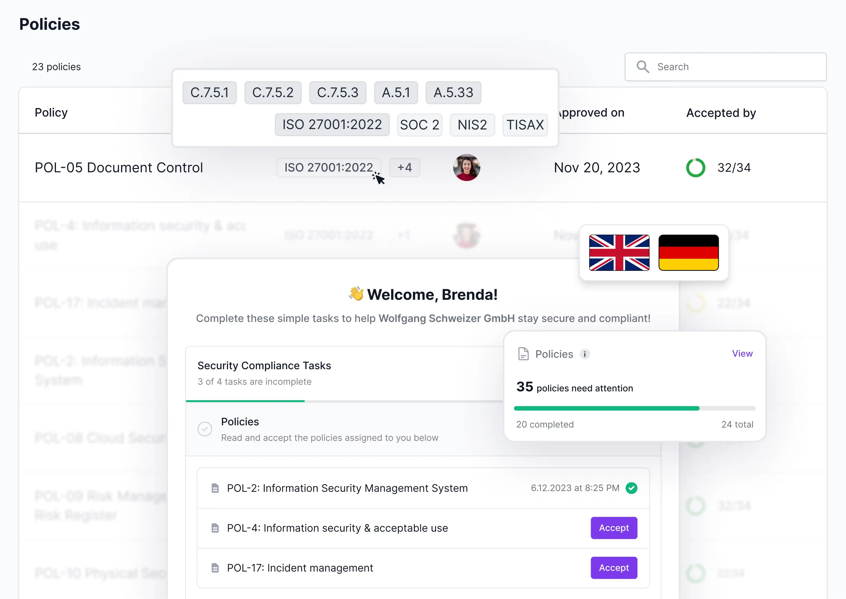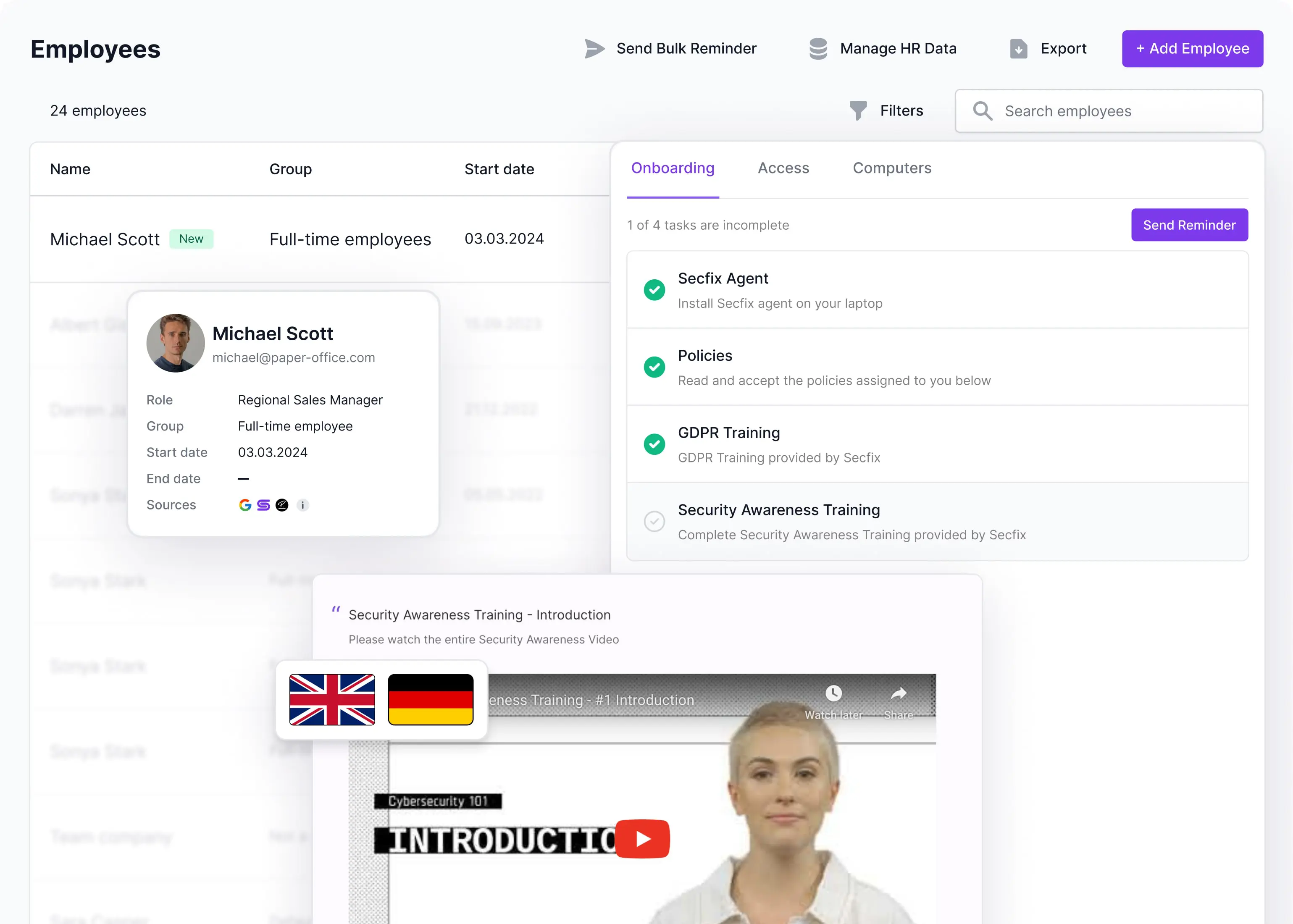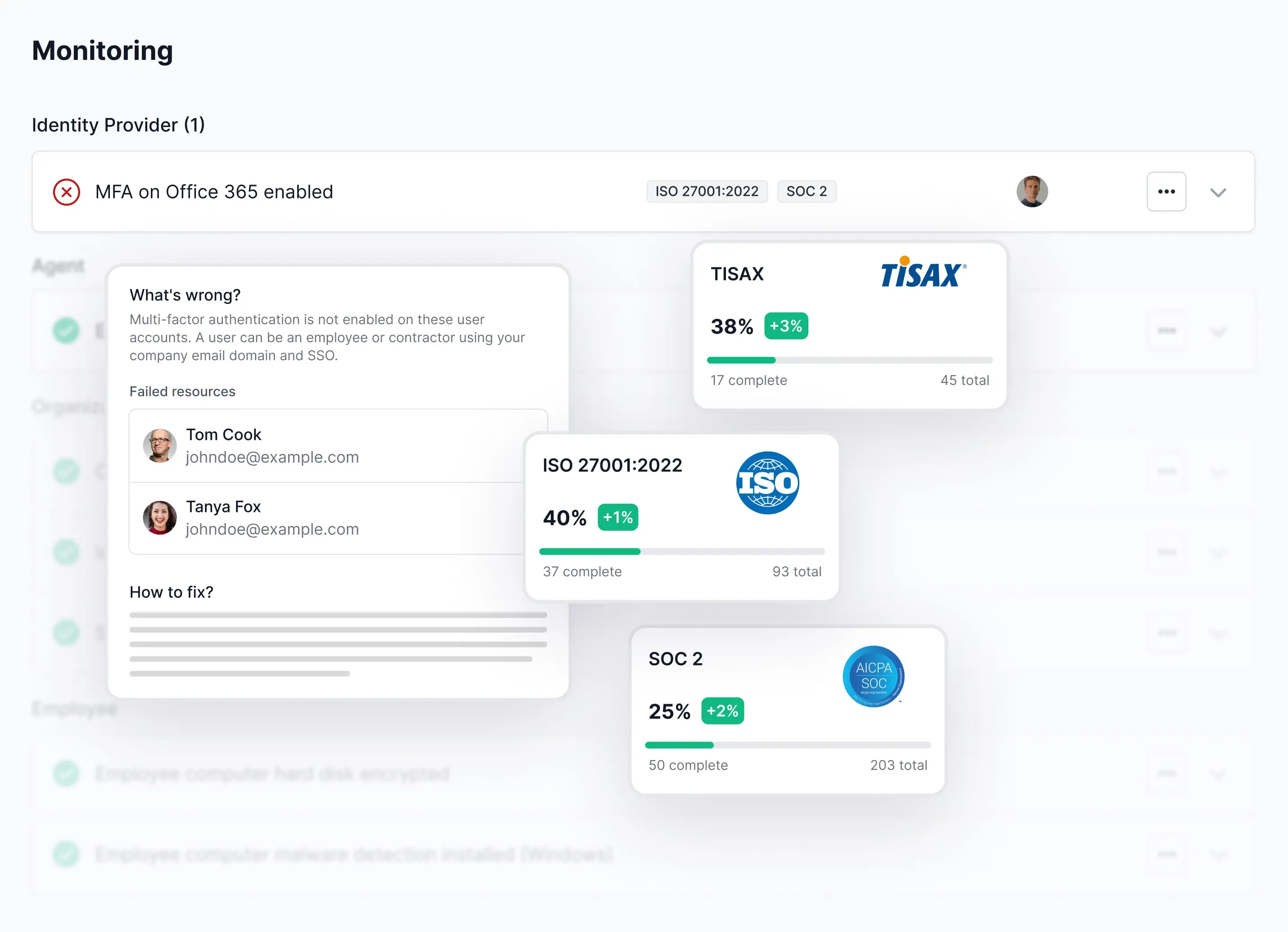 Automate onboarding and offboarding, track tasks with reminders, and manage security trainings across multiple frameworks. Keep your team compliant easily and accurately.
