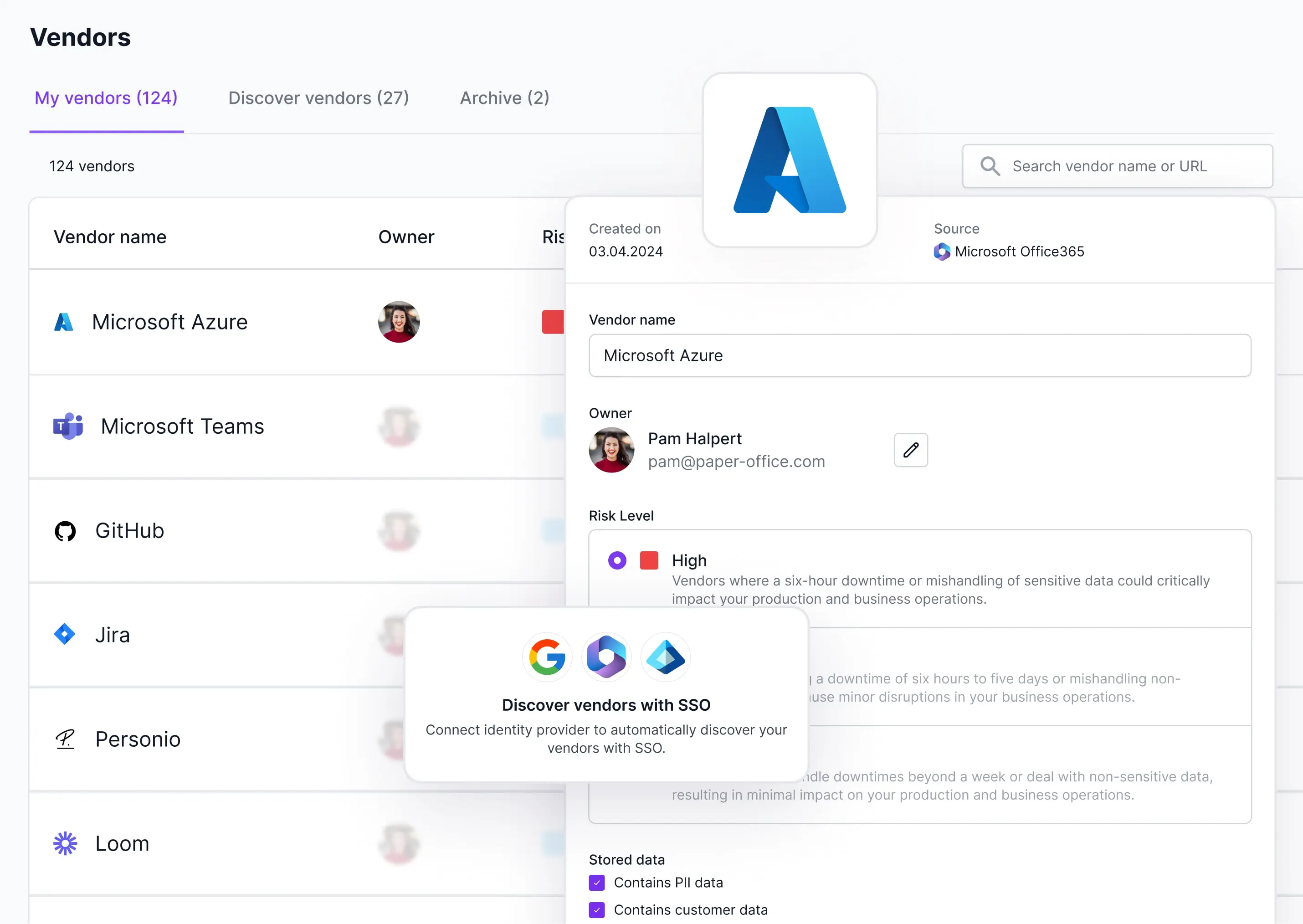 Automatically discover new vendors via Google Workspace or Office365 SSO. Track risks, manage security reviews, and keep vendor assessments up-to-date with Secfix.